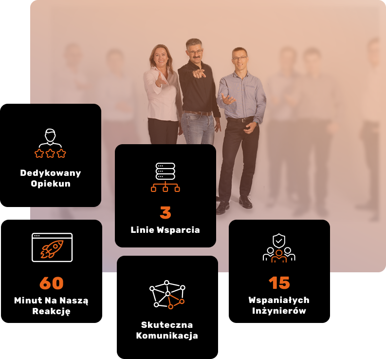 Nasze motto oznacza, że jeśli nie działa technologia to problem mają ludzie, gdyż nie mogą wykonywać swoich obowiązków. Dlatego w przypadku wystąpienia problemów lub awarii skupiamy się na jak najszybszej neutralizacji awarii i dostarczaniu rozwiązania, które umożliwi jak najszybszy powrót działania Twojego biznesu.